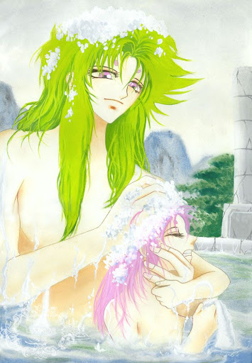 果然,画面里有一个紫色头发的孩子正在洗澡,背后站着一个身形极为俊美,草绿色头发的男子,轻轻揉搓着穆的头发。如果没猜错,这个人应该是史昂。似乎有泡沫进了穆的眼里,穆用力地揉眼睛。史昂连忙蹲下,一边用清水帮他洗眼,一边假装嗔怒道:“眼睛是不能揉的,你那么美丽明亮的眼睛要是揉红了多难看啊!来,穿上衣服出来吧,师父给你点几滴眼药水。”